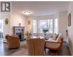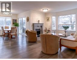 $414.97 MonthlyTastefully renovated corner unit in the desirable 55+ MacIntosh Grove, offering easy, low-maintenance living just steps from downtown. This bright and spacious home features just under 1,300 sq. ft. with 2 bedrooms and 2 bathrooms, and has been recently updated with new flooring, a renovated kitchen with new appliances and countertops, fresh paint, and updated bathrooms. The inviting living room includes a newer AC unit, cozy gas fireplace (included in the strata fee) and flows seamlessly into the formal dining area and eat-in kitchen with access to a wrap-around, covered balcony featuring mountain views. The well-designed layout offers generous room sizes, a primary bedroom with walk-in closet and full ensuite (dual vanities). The kitchen provides ample cabinetry, tile backsplash, stainless appliances. A separate laundry room includes extra storage and room for a freezer. Convenient elevator access ensures effortless entry to this unit—simply move in and enjoy. MacIntosh Grove amenities include underground parking, RV parking, a common gathering room with kitchen, craft room, exercise room, and workshop. Public transit, shopping, restaurants, and downtown are all within walking distance. Quick possession available. (id:26472)