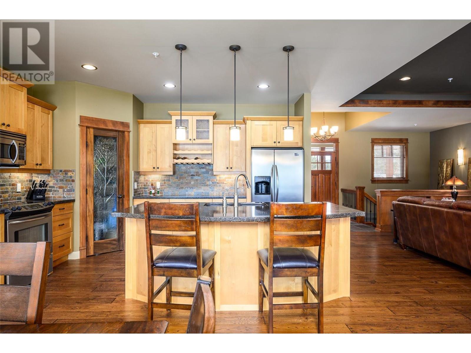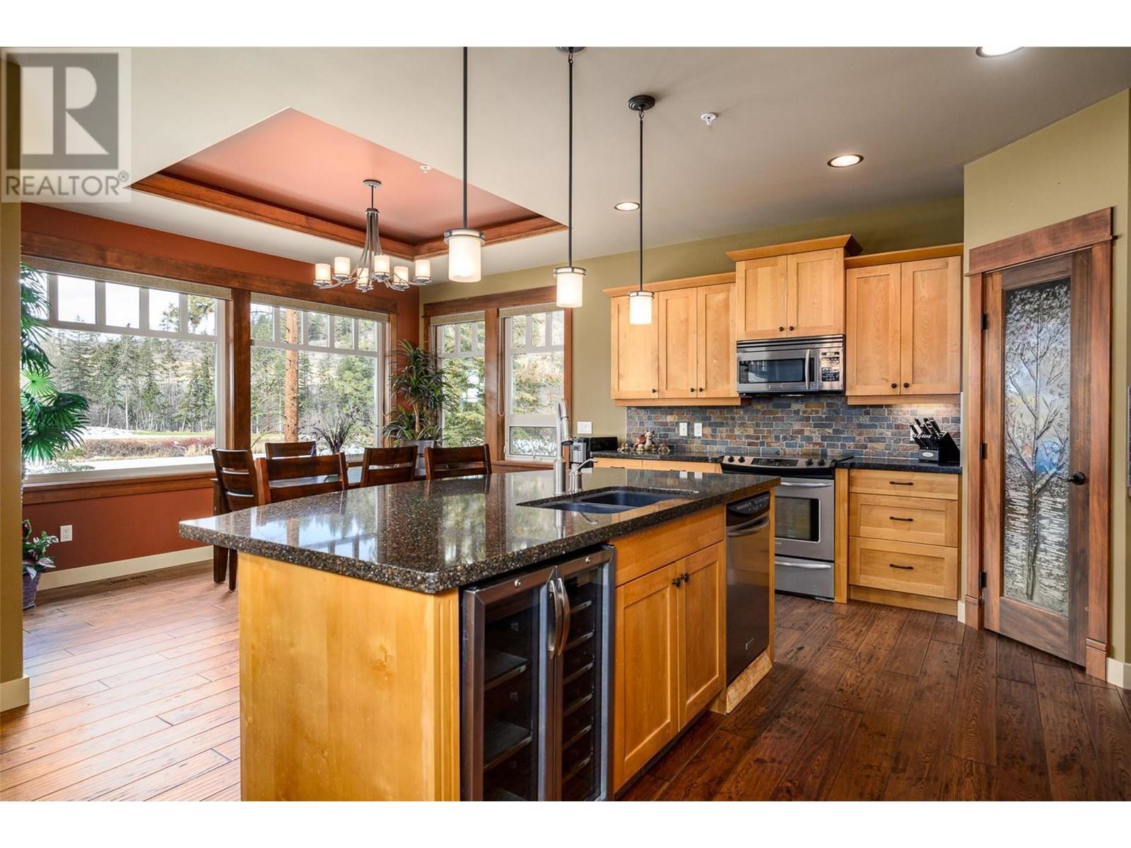 $759.64 MonthlyOverlooking Birdie Lake – spectacular location, west facing view of hole 15 of the Ridge Course! A coveted, small enclave of only 6 exceptional craftsman style ranchers with walk-out lower levels in this full strata. #4 features open concept main floor with luxurious hardwood flooring, high trayed ceilings, a beautiful stone feature fireplace & extensive fir treatment throughout. Large kitchen with lots of cabinetry, walk-in pantry, stainless appliances including a wine fridge, island bar & quartz countertops. Retreat down to your family room, 2 primary bedrooms both with ensuites. Covered flagstone front porch, covered deck with remote controlled sunscreens & covered lower patio provide just enough shade to enjoy that late afternoon refreshment as you watch golfers going for that hole-in-one! An extra deep single car garage easily fits your car + golf cart. Golf membership available, valued at $55,000 with $13,750 transfer fee payable by buyer within 12 months of closing. Having two world class golf courses to play is a golfer's dream come true! And only a short distance away, just up the hill, we couldn't have asked for a better neighbour with Sparkling Hill Wellness Hotel & their beautiful world class spa. Sparkling Hill is the world's best wellness hotel in the mountain category! Kalamalka & Okanagan Lakes are a short drive for untold hours of boating & swimming! Skiing at Silver Star is only 45 minutes away! See why this is one of the best places to live! (id:26472)