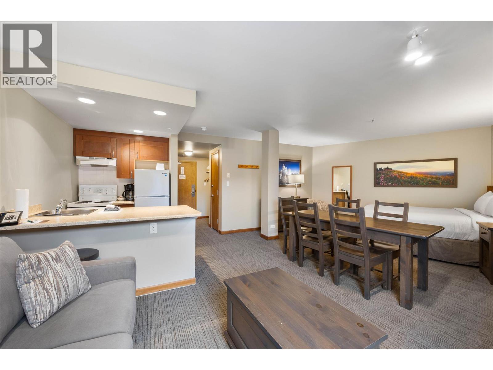 $578.99 MonthlyBoasting one of the best ski-in / ski-out locations at Sun Peaks, this upgraded Grand Studio sleeps 4, and is located just steps from Sun Peaks Village amenities. Enjoy single level living with a fully equipped kitchen; including a standard sized fridge, stove & dishwasher - perfect for longer stays. Gather around the cozy fireplace after a day on the slopes and take in the views to Mount Morrisey. Hotel amenities include indoor and outdoor hot tubs for your relaxation at the end of your day, a gym, ski storage, coin operated laundry facilities, wireless internet, and in-house restaurant. Relax and leave all the details to the professional and friendly in-house management team (Bear Country). Revenues in place for the 2025/26 ski season. Venture just steps from the door to activities such as biking, hiking, golf, alpine & Nordic skiing. Fully furnished; GST applies. (id:26472)