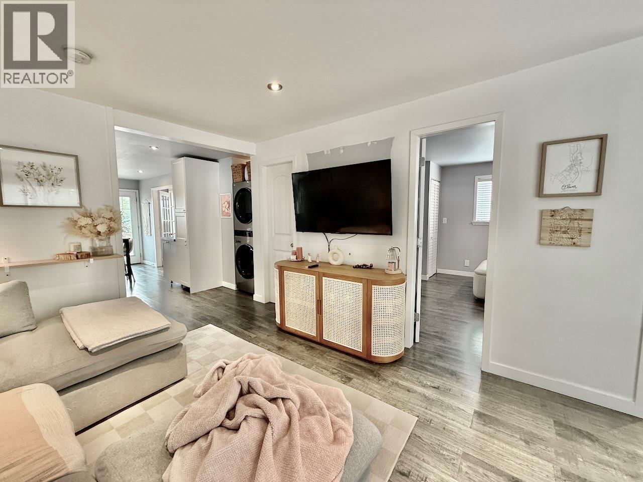 Tastefully updated 2 bedroom, 2 bathroom level entry home in central Oliver with stunning views of the dramatic 'Rockcliffes' right out your front door. This small but mighty and charming home has been extensively modernized with luxury vinyl plank flooring throughout, a bright island-style kitchen with tasteful backsplash, abundant storage, and great built-ins. Both bathrooms, kitchen, windows, doors, heating, A/C, and decks have all been redone, along with updated plumbing, advanced water purification, and a new hot water tank. The main-floor laundry adds convenience, while the outside access cellar-style basement provides ample utility and extended storage options for seasonal items. Great carport. Full alley access in the back yard. Step outside of the lavish kitchen to enjoy a romantic patio and a fully fenced, manicured backyard oasis with alley access and plenty of parking. Ideal for empty nesters or a small family seeking comfort and practicality at an affordable price point — offering far more space and lifestyle than condo living. Move-in ready and waiting for you! Lots of Potential-- even the possibility of second dwelling built off of the alley. (id:26472)