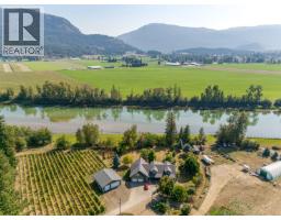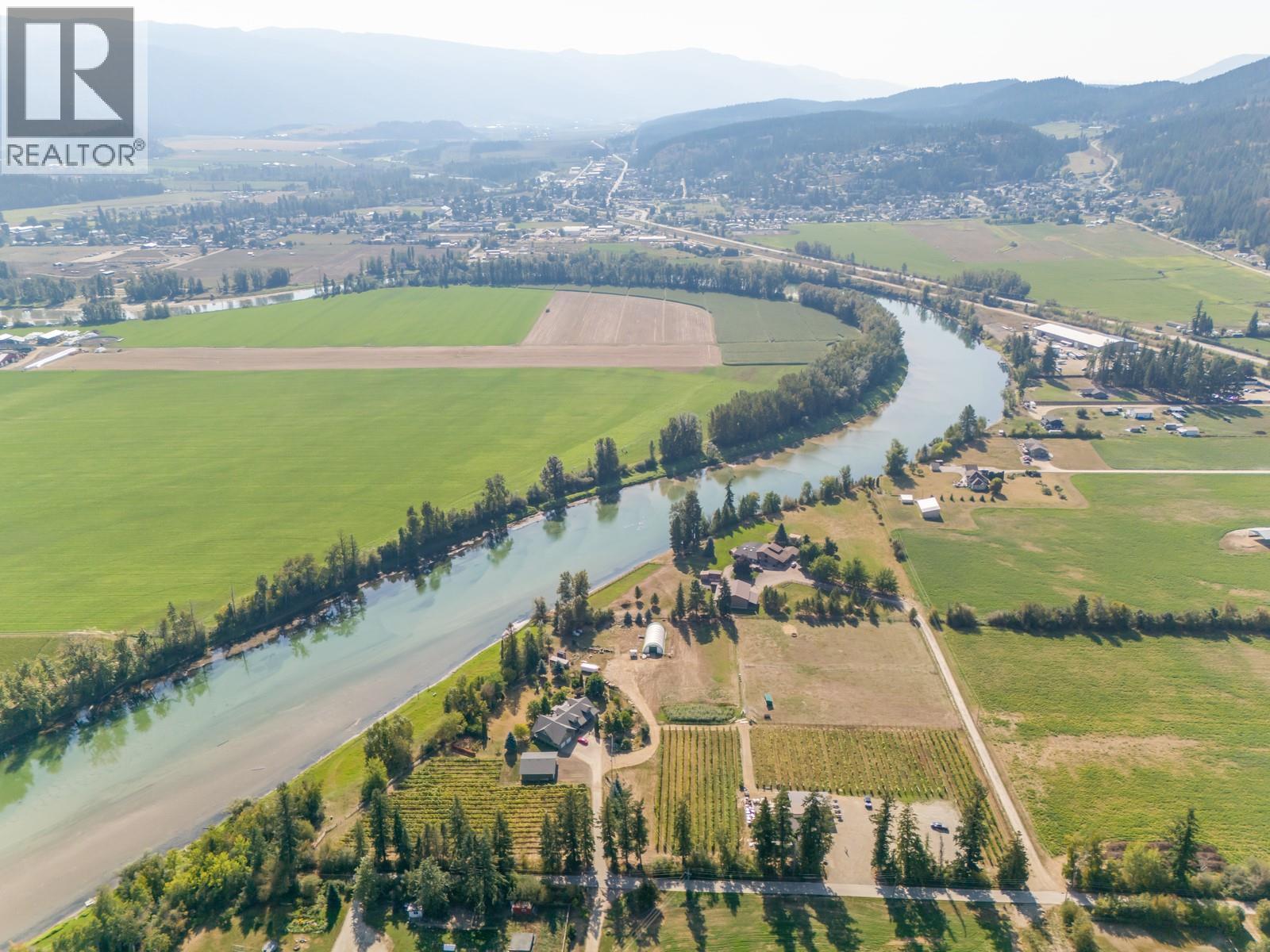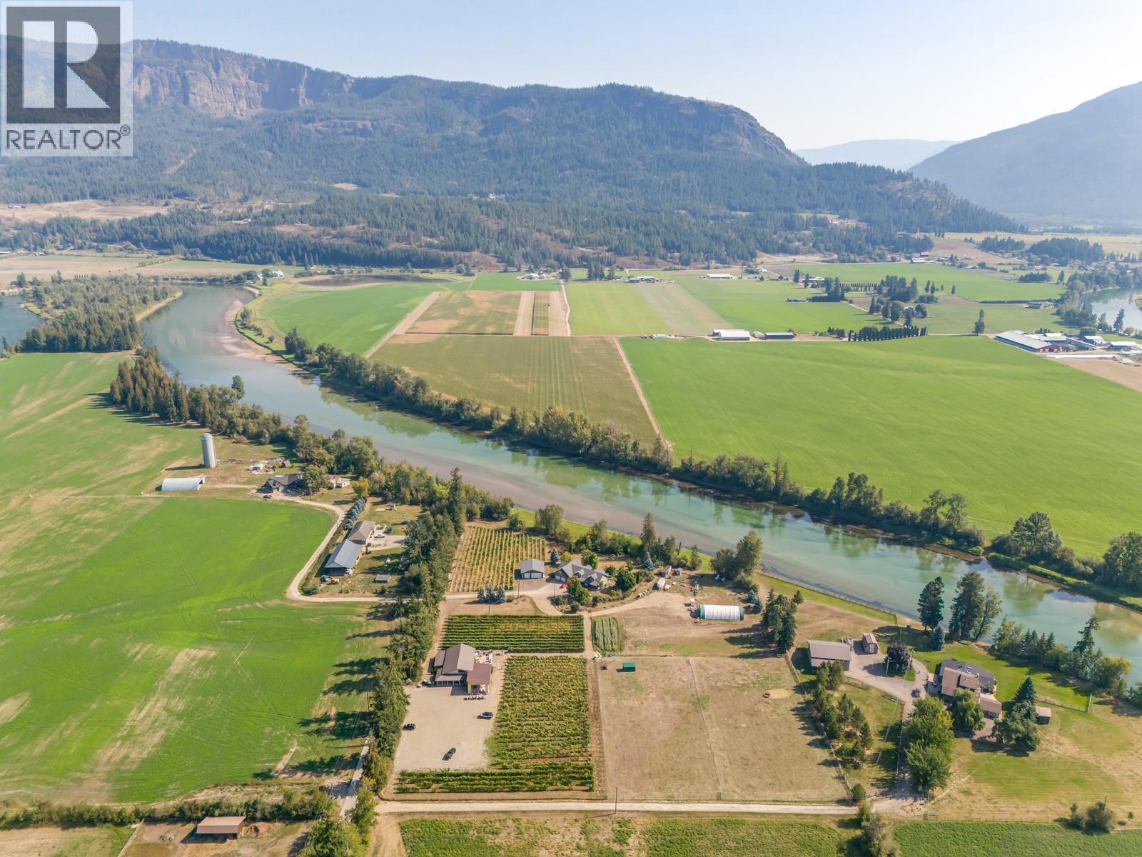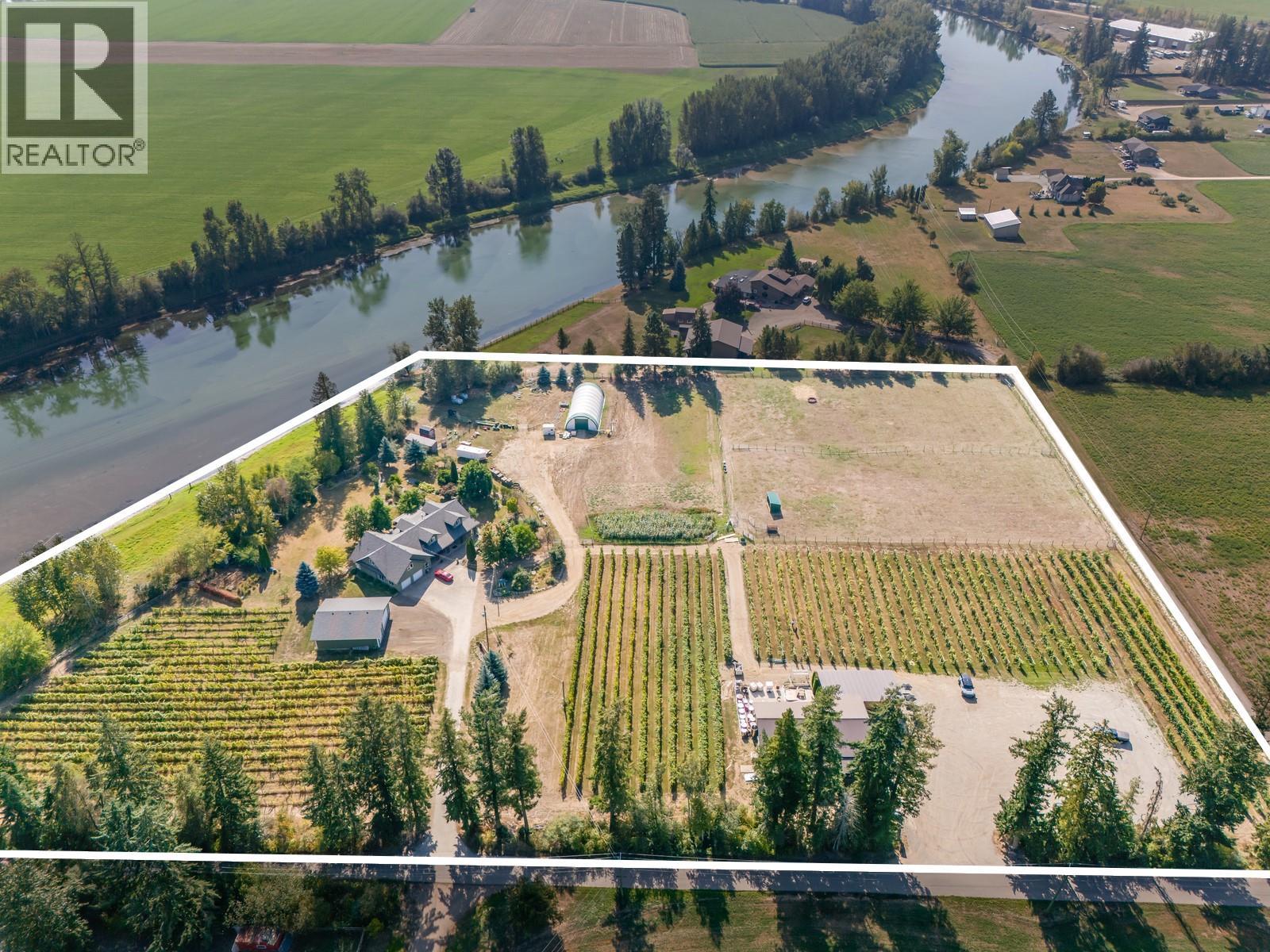 Live the Okanagan dream on this rare 9.14-acre riverfront vineyard estate in the heart of Enderby. With over 500 feet of Shuswap River frontage, breathtaking views of the Enderby Cliffs, and unmatched versatility, this property offers more than just a home—it offers a lifestyle and a business opportunity all in one. The main residence spans 4,500+ sq. ft., featuring 5 bedrooms + den, 3 baths, a chef’s kitchen with a commercial gas range, expansive living spaces, and a screened-in patio with outdoor kitchen. A new 36’x40’ insulated shop, coverall barn, and fully fenced paddocks make it ideal for horses, cattle, or hobby farming. In addition, a ~2,600 sq. ft. insulated secondary building currently operates as a winery, brewery, and event space—complete with food service facilities, tasting room, and a brand-new covered patio perfect for live music and weddings. This building can also be easily converted into a second full residence, offering multi-generational living or rental options. The land is fully irrigated with 6.5 acres planted to red and white varietals plus abundant fruit trees, asparagus, corn fields, and more—perfect for a farm-to-table venture or farm stand. Buyers also have the opportunity to purchase an established beverage company already distributed in liquor stores across BC, adding tremendous value for those seeking an agri-business expansion. With licences in place, the property is also a lucrative wedding and event destination, offering multiple revenue streams. Whether you’re envisioning a private family retreat, a thriving vineyard and event destination, or a legacy estate to build on for generations, this is a turnkey agri-business with expansion potential! (id:26472)