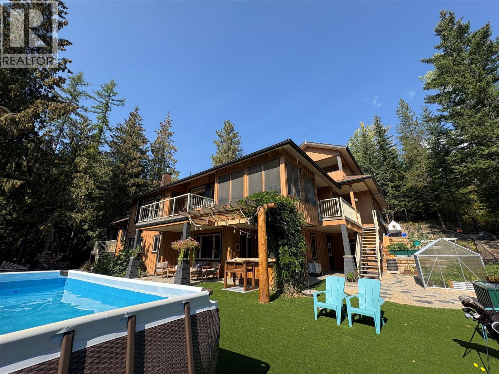 Escape to this exceptional 2.47-acre mountain retreat just 12 minutes from SilverStar. Built by award-winning Bercum Builders, this home blends rustic elegance with modern upgrades. Vaulted ceilings, timber beams, and expansive windows create a warm, light-filled space anchored by a wood-burning fireplace. The gourmet kitchen has been renovated with quartz countertops, new appliances, and a butler’s pantry connecting to a peaceful screened-in lanai. The primary suite features a spa-like ensuite and a private deck with a cedar barrel sauna. The walkout lower level includes two bedrooms, a full bath, family space, and mudroom. Above the garage, a self-contained studio with private entrance, bath, and balcony is ideal for guests or home office. Outdoors, enjoy private hiking trails, a seasonal creek, greenhouses, and an entertainer’s patio with outdoor kitchen and turf terrace. Recent upgrades include new heating system, 2024 septic, fire mitigation, and 50-year roof. Truly a rare lifestyle opportunity. (id:26472)